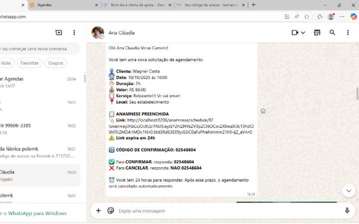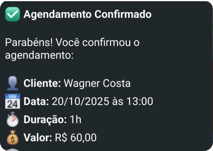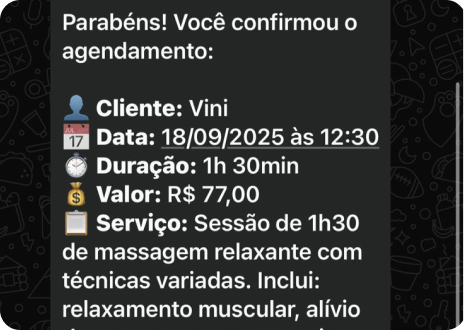 A cada novo agendamento, você é informado instantaneamente no seu WhatsApp. E com um clique, você pode aprovar o horário, mantendo total controle da sua agenda.