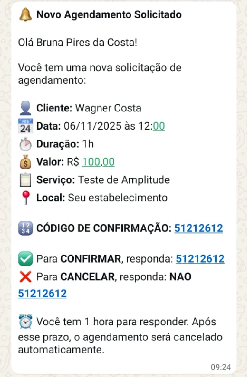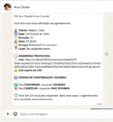A cada novo agendamento, você é informado instantaneamente no seu WhatsApp. E com um clique, você pode aprovar o horário, mantendo total controle da sua agenda.